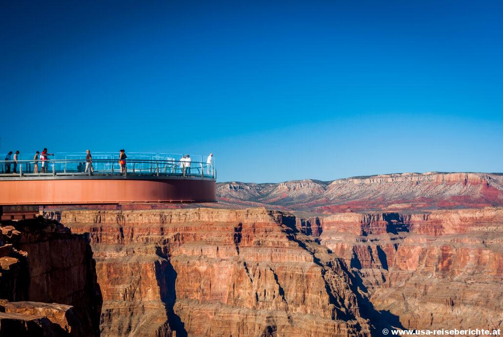 Der Grand Canyon Skywalk liegt in der Hualapai Reservation am westlichen Rim des Canyons und ist die von Las Vegas aus am schnellsten erreichbare Aussichtsplattform. Seit 2007 können Besucher hier eine Aussichtsplattform betreten, die über den Rand des Canyons hinausragt. Die Besonderheit: der Boden dieser Plattform besteht aus Glasplatten. Dadurch erhält man den Eindruck, über dem Rand zu schweben.