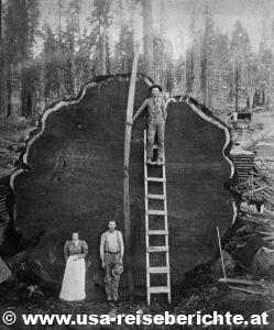 Hier stehen bzw. liegen die Riesenmammutbäume direkt neben der Straße. Beim Visitor Center steht auch eine dicke Baumscheibe, kleine Metallplaketten kennzeichnen wichtige Ereignisse der Weltgeschichte an den Baumringen.